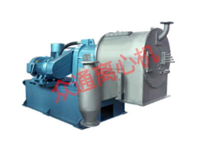 主電機帶動套裝的內、外轉鼓全速旋轉,物料由進料管連續引入,均勻分布到內轉鼓內段濾網壁上,在離心力作用下,液相物穿過濾網和轉鼓壁濾孔排出,經排液管排出機外,固相物截留在內轉鼓形成環形濾餅層。內、外轉鼓同速旋轉的同時,在活塞推動下,內轉鼓連續軸向往復運動,因而推料盤推動內轉鼓濾餅層間歇不斷地向外移動排出內轉鼓,進入外轉鼓進一步分離并形成環形濾餅層,內轉鼓外端面則推動外轉鼓濾餅層間歇不斷地向外移動排出外轉鼓,經刮料槽排出機外。