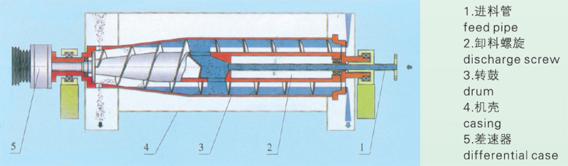 電機帶動無孔轉鼓及同心安裝的輸料螺旋,以一定的差速同向高速旋轉。物料由進料管連續引入輸料螺旋內筒,加速后進入轉鼓,在離心力作用下,較重的固相物沉積在轉鼓壁上形成沉渣層。輸料螺旋將沉積的固相物連續不斷地推至轉鼓錐端,經排渣口排出轉鼓及機外。較輕的液相物則形成內層液環,由轉鼓大端溢流口連續溢出轉鼓,經排液口排出機外。